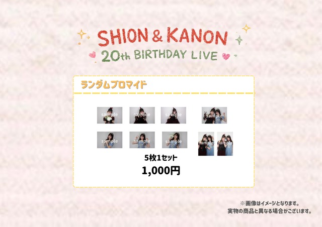 2026.3.20 『SHION & KANON 20th BIRTHDAY LIVE』 限定販売予定でした、ランダムブロマイドを数量限定販売! ランダム5枚1セットです。 ※商品のお届けまで2週間ほどお時間いただきます。 ※数量限定のためなくなり次第販売終了となります。 ※購入後の返金交換はお受けいたしかねます。